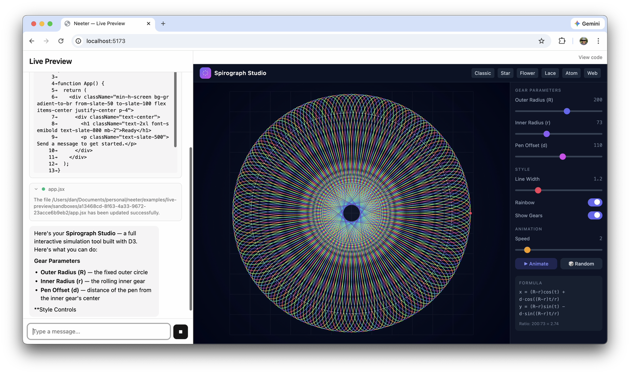 The spirograph studio above was built by Opus 4.6 using the code-workbench example — a split-pane coding assistant with live preview, per-session sandboxes, file checkpointing, and session resume.