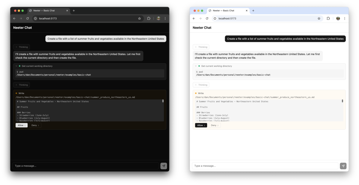 When you add tools to your SessionManager, neeter automatically renders them with purpose-built widgets — diff views for edits, code blocks for file reads, expandable link pills for web searches, and so on. No configuration needed.